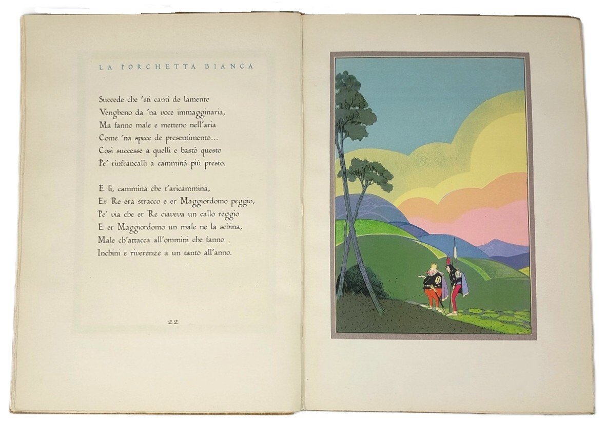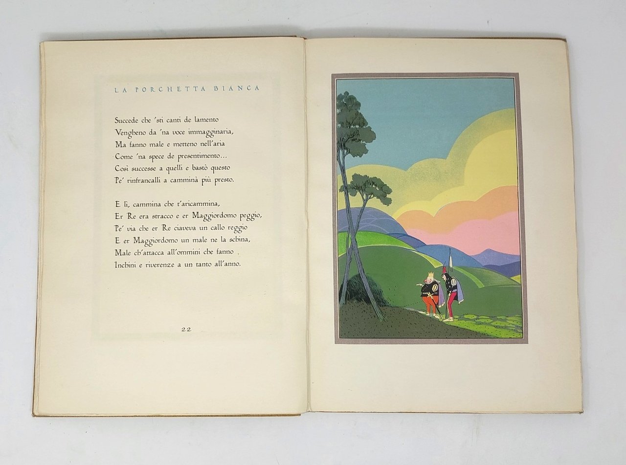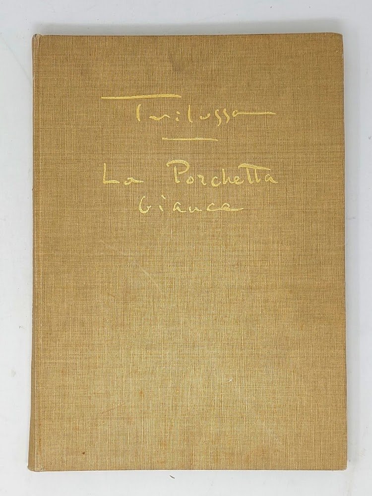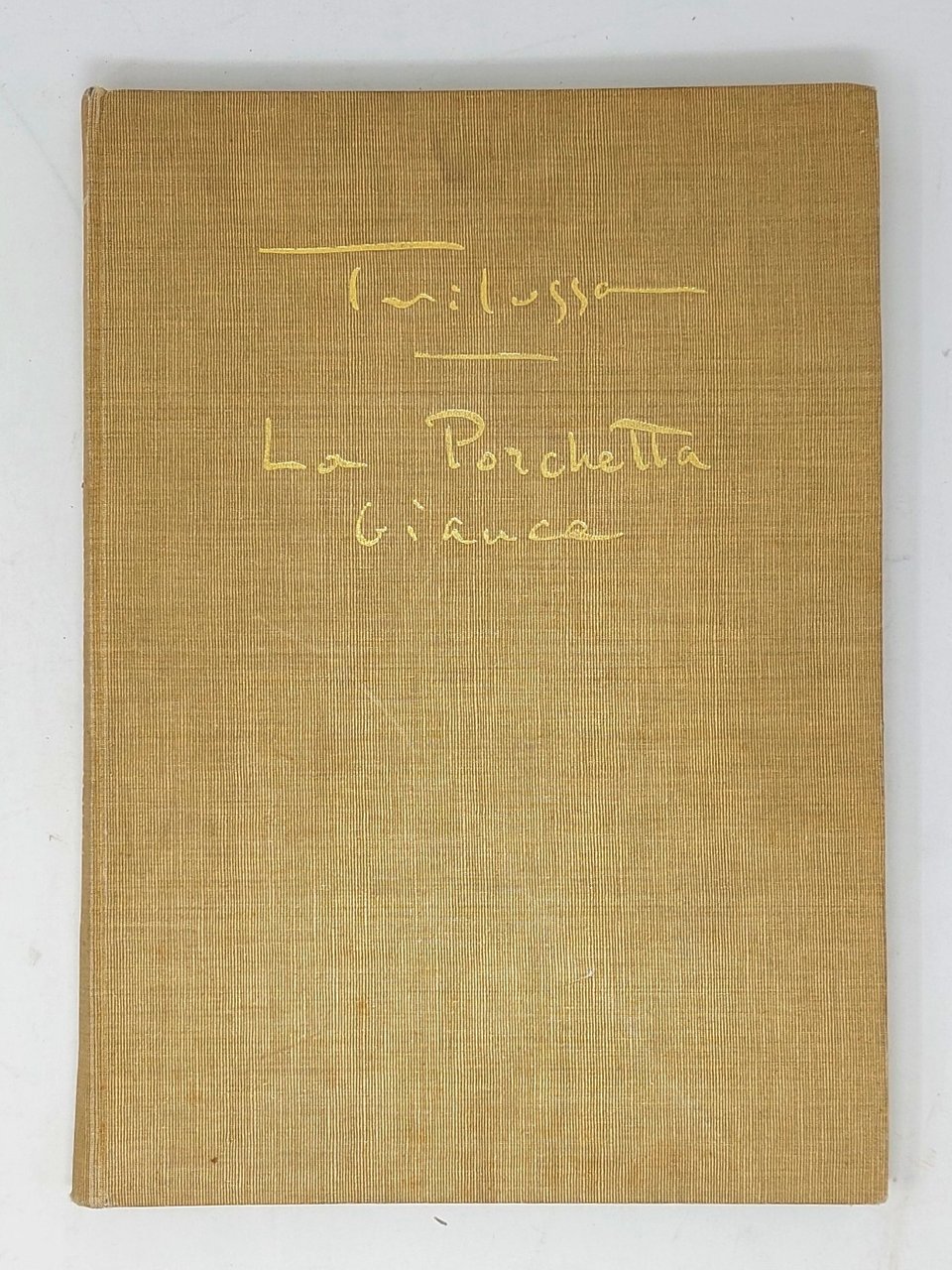 >in-4, pp. 73, legatura editoriale in tela, titolo oro inciso sul piatto superiore e lungo il dorso. Edizione originale, impressa nell'Officina Bodoni con carattere umanistico su carta di Fabriano in mille esemplare numerati (n.30). Nel 1929 Trilussa realizzò l'edizione di lusso de La Porchetta Bianca - l'unico poemetto satirico a cui il poeta si era dedicato sin dal 1906. L'edizione è illustrata dalle tavole di Galantara che si firmò con lo pseudonimo di Bruno Serpi. Le 32 illustrazioni risaltano per la freschezza poetica e per i colori vivaci. Non comune e in buono stato di conservazione. Gambetti Lucio-Vezzosi Franco, La letteratura italiana del Novecento. Repertorio delle prime edizioni. Genova: Graphos, 1997, 480. Jentsch 543.