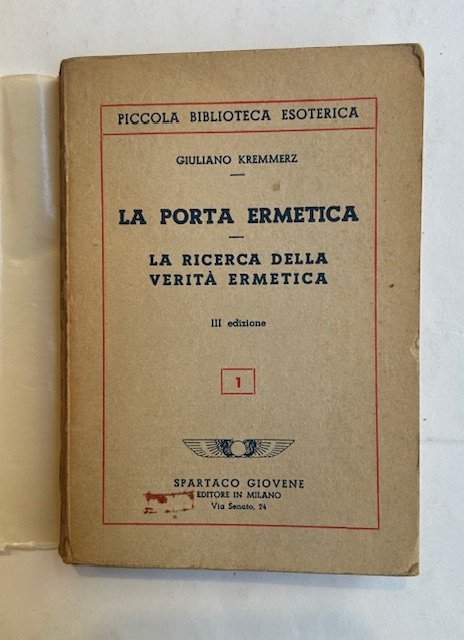 In-16°,pp. 237, 3 tavole f.t. rip., brossura editoriale. Piccola Biblioteca Esoterica 'Un volumetto Giuliano Kremmerz, al secolo Ciro Formisano (nato il 1861 mor.to il 1930), il più autorevole cultore di studi ermetici in Italia alla fine del secolo scorso ed all'inizio di questo secolo, apre la nostra «piccola biblioteca esoterica». Tale volumetto può ben a ragione considerarsi fondamentale per tutti coloro che si orientano verso gli studi di esoterismo, e può raddrizzare molte idee storte a tutti coloro che sono orrientati verso le varie forme di misticismo più o meno indianizzante, e che, sentano la necessità di concluderei e di vedere un pò più chiaro tra molte chiacchiere, che il più delle volte hanno il solo pregio di essere poeticamente suggestive. Ne consigliamo la lettura attenta e scevra di idee preconcette e di pregiudizi; e per coloro che lungamente hanno cercato un uomo onesto che parlasse il linguaggio chiaro e sereno del maestro di vita umana per aiutarli a risolvere il problema che la Sfinge ha posto e che nessun mortale ha sinora risolto questo libriccino sarà una rivelazione.' L'EDITORE Milano - Luglio 1944.