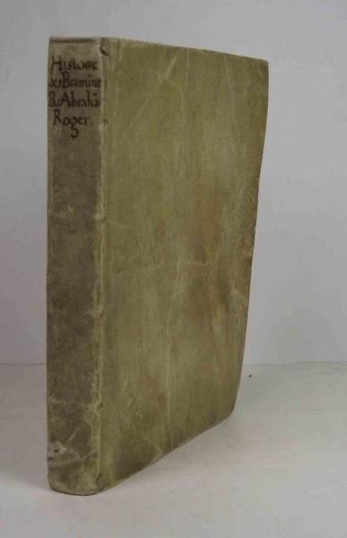 Cm. 23,2, pp. (16) 371 (5). Bell’antiporta allegorica incisa, 5 figure nel testo a mezza o piena pagina ed una tavola ripiegata f.t. Un piccolo difetto al piatto posteriore, ma bell’esemplare nella sua prima legatura in pergamena con titoli ms. al dorso. Prima edizione francese, dopo l’originale olandese del 1651, di questo testo fondamentale sulla religione indiana. Il pastore protestante olandese Roger fu il primo, attraverso quest’opera, a far conoscere in Europa la religione induista. Il prezioso insieme di notizie fa raccolto in dieci anni di permanenza sulle coste dell’India Orientale dal 1640 al 1650. Il testo termina con un estratto dalla "Chine illustree" di Kircher. Cfr. Graesse VI, 147. Raro, soprattutto in tale ottimo stato di conservazione.