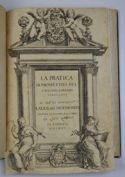 Due parti in un volume di cm. 27. Prima parte con frontespizio inquadrato da grande cornice architettonica, cc. (4) + 44 con 43 incisioni a piena pagina. Seconda parte con ulteriore bel frontespizio decorato seguito da altre 21 tavole. Legatura ottocentesca in mezza pelle. Ritocchi al dorso, primo frontespizio un po' brunito e rifilato agli estremi (ripiegata la parte inferiore). Esemplare peraltro completo ed in buono stato di conservazione (lavato?). Il presente esemplare porta la dedica al principe di Polonia. Reimpressione che ricalca l'originale cinquecentesco di questo classico che viene considerato il miglior testo del tempo riguardante lo studio della prospettiva. Particolarmente affascinante l'apparato iconografico, soprattutto nella parte finale dove appaiono, secondo il gusto dell'epoca, poliedri di varie forme e solidi regolari. Cfr. Riccardi (II, 460): "La prospettiva del Sirigatti ha il merito di essere uno dei primi, se non de' più completi trattati di questa scienza; ed da tenersi in pregio l'essere dettata in buona favella, sì che venne citata dal Colombo, dal Gamba e dal Fontanini"; Cicognara 861 e Schlosser Magnino a p. 422.