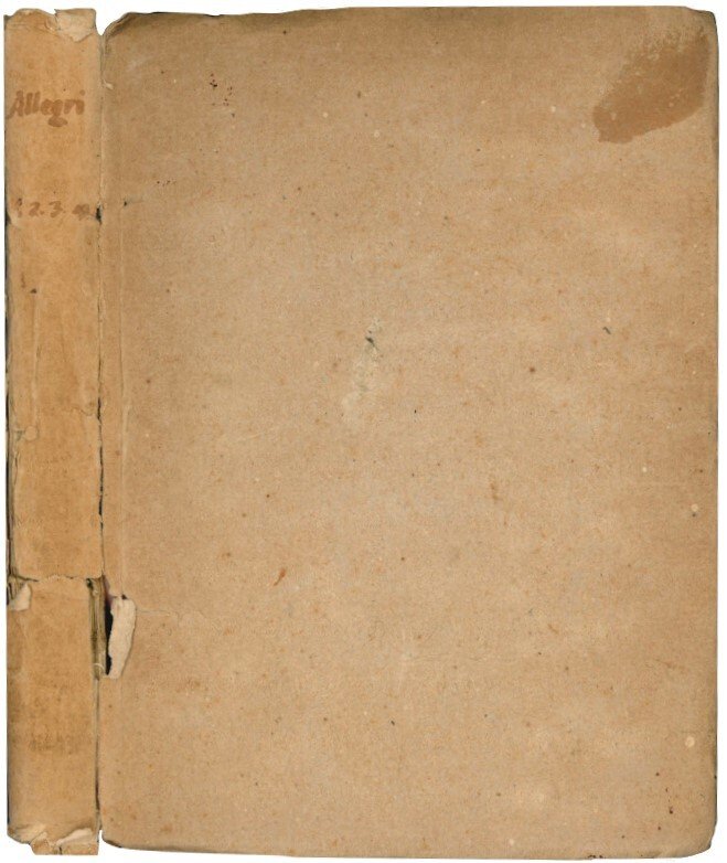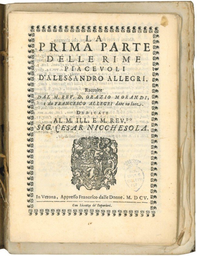 La prima parte delle rime piacevoli d'Alessandro Allegri. Raccolte dal M. Rev. D. Orazio Morandi, e da Francesco Allegri. Dedicate al M. Ill. e M. Rev.do Sig. Cesar Nicchesola. Verona, Appresso Francesco dalle Donne, 1605. [Legato con:] IDEM. Seconda parte delle rime piacevoli […] Verona, Bartolamio Merlo dalle Donne, 1607. [Legato con:] IDEM. La terza parte delle rime piacevoli […] Firenze, Giovanni Antonio Caneo e Raffaello Grossi, 1608. [Legato con:]. IDEM. La quarta parte delle rime piacevoli […] Verona, Bartolamio Merlo dalle Donne, 1613.