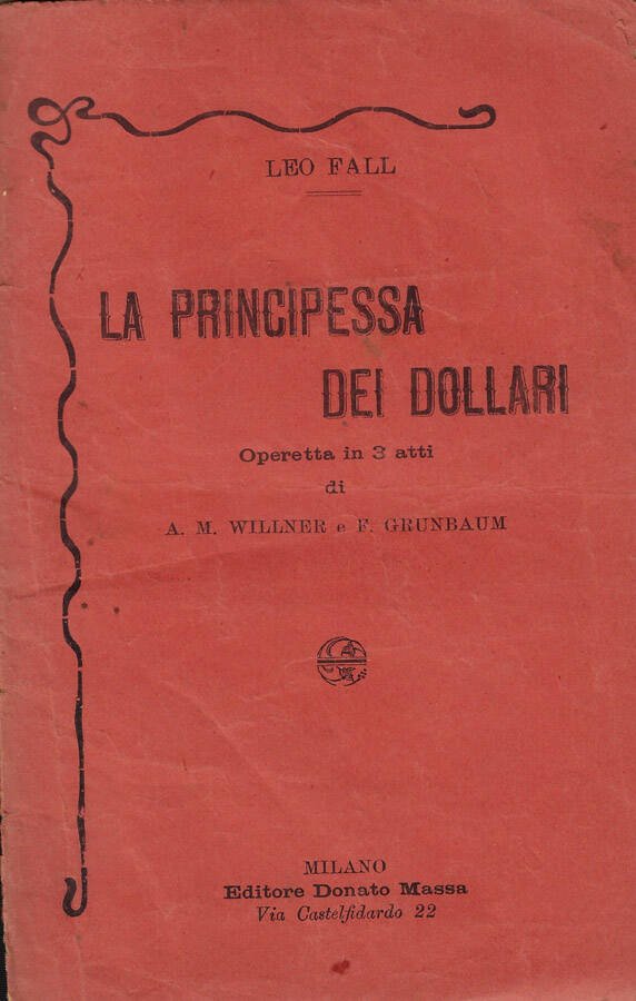 Operetta in 3 atti di A. M. Willner e F. Grunbaum. Brossura scurita ed abrasa dal tempo. Pagine ingiallite, con gore e fioriture sparse, distaccate dalla numero 3 alla numero 14. Numero pagine 16.