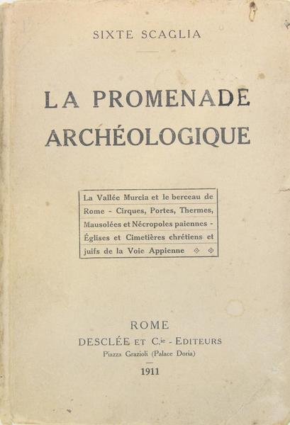 Desclée et cie éditeurs, Rome, 1911. In-12 (17 x 12 cm) cartonnage éditeur imprimé, 50 illustrations (photographies, plan) en noir, 175 pages. Cartonnage défraîchi. La vallée Murcia et le berceau de Rome, Cirques, portes, thermes, mausolées et nécropoles paiennes, églises et cimetières chrétiens et juifs de la Voie Appienne.