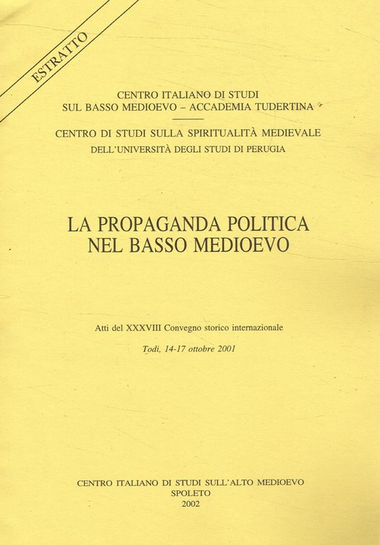 Estratto, all'interno testo di Ludovico Gatto dal titolo Temi e spunti di propaganda politica nella Roma del Trecento: il caso Cola Di Rienzo, numerazione da 411 a 453, copertina editoriale flessibile, con lievi segni di usura alle punte e piega alla cima del dorsetto, pagine in buonissimo stato di conservazione. Numero pagine 42
