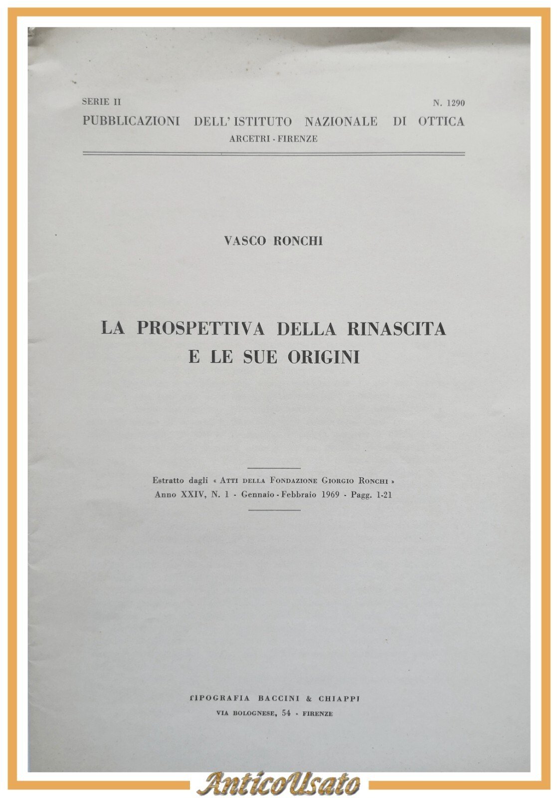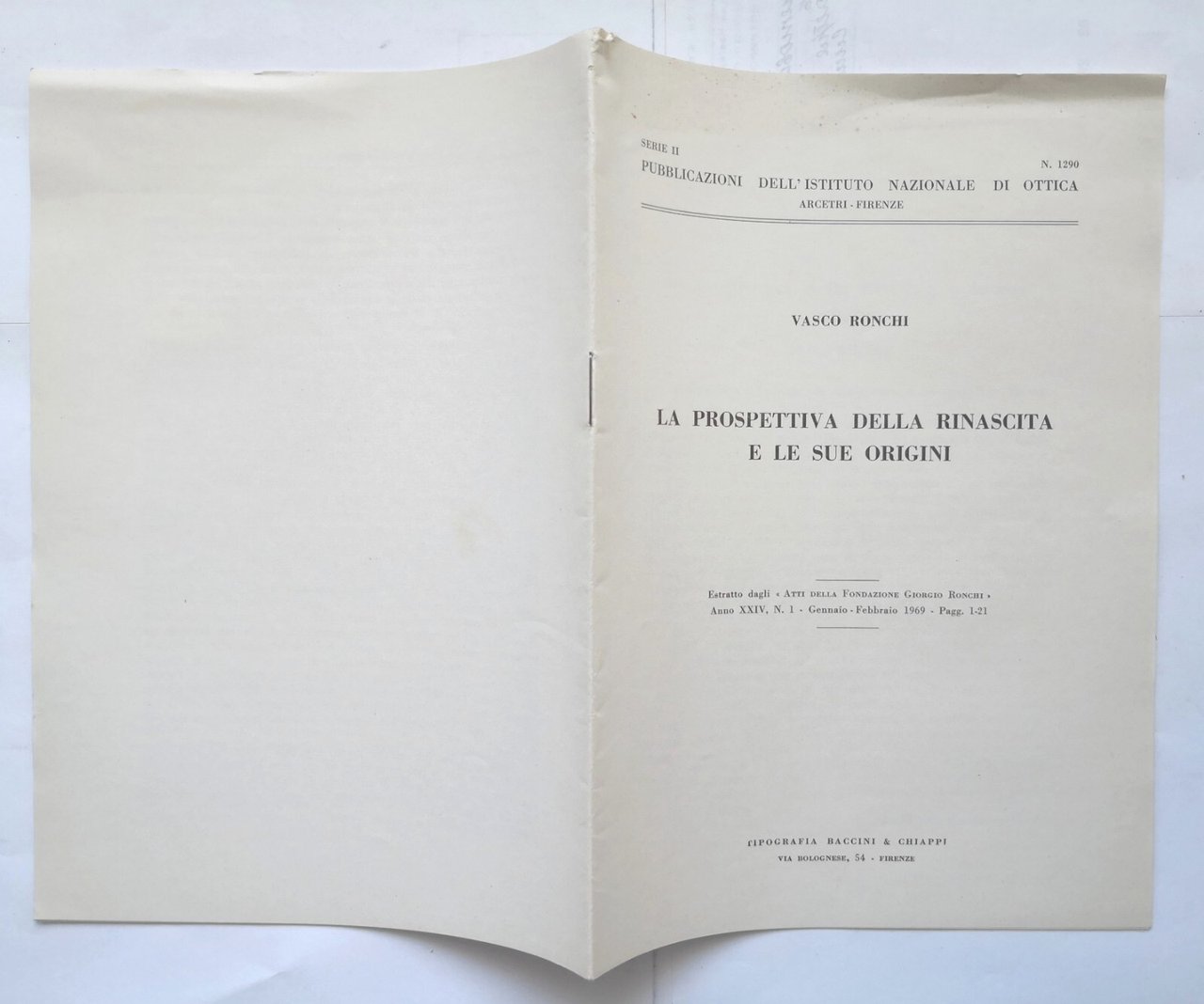 LA PROSPETTIVA DELLA RINASCITA E LE SUE ORIGINI di Vasco Ronchi. Estratto dagli "Atti della Fondazione Giorgio Ronchi" Anno XXIV, Numero 1 gennaio febbraio 1969.