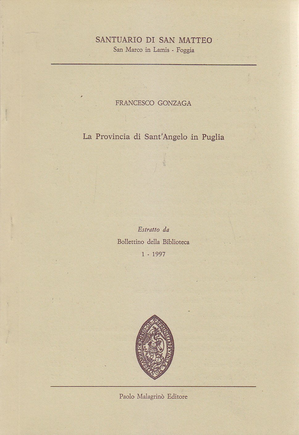 LA PROVINCIA DI SANT'ANGELO IN PUGLIA Francesco Gonzaga 1997 Malagrinò libro su