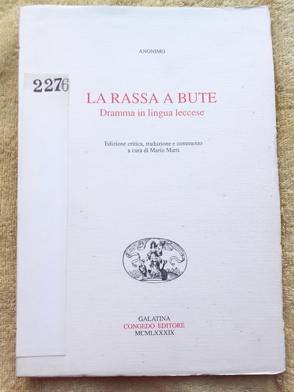 LA RASSA A BUTE: DRAMMA IN LINGUA LECCESE., Edizione critica, traduzione e commento a cura di Mario Marti.