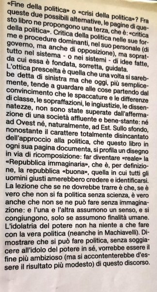 Soggetti: Politica, Società civile, Storia d'Italia, Ideologie politiche, Storia contemporanea, Prima Repubblica, Saggistica, Critica, Analisi, Partiti politici, Democrazia cristiana, DC, PCI, PSI, PRI, Radicali, Referendum, Divorzio, Aborto, Scuola, Istruzione, Salario, Partito Comunista Italiano, Sinistra, Destra, Classe dirigente, élite, Potere, Socialismo, Capitalismo, Misteri, Rivoluzione culturale, Marxismo, Sessantotto, Rapimento Moro, Vicende storiche, Economia, Terrorismo, Brigate rosse, Stragi, Mafia, Compromesso storico, Strategia della tensione, Sindacalismo, Diritti sociali e civili, Elezioni, Voto, Sistema elettorale, Clientelismo, Corruzione, Istituzioni, Ricambio politico, Riforme, Intellettuali, Televisione, Giornalisti, Benessere, Integrazione, Cicli, Felicità, Welfare, Linguaggio, Trasformismo, 1989, Muro di Berlino, Cortina di Ferro, Unione Sovietica, Crollo, Crisi, Valori, Occidente, Guerra Fredda, Americani, Politica estera, 1956, Rivoluzione, Riformismo, Nomenclatura, Mediazione, Rappresentanza sociale, Industria, Stato, 1977, Contestazione, Costumi, Studenti, Masse, Alleanze, Beppe Grillo, Libri Vintage, Fuori catalogo, Politics, Civil Society, History of Italy, Political Ideologies, Contemporary History, First Republic, Non-Fiction, Criticism, Analysis, Political Parties, Christian Democracy, Radicals, Divorce, Abortion, School, Education, Salary, Italian Communist Party, Left, Right , Leadership Class, Power, Socialism, Capitalism, Mysteries, Cultural Revolution, Sixty-eight, Moro Abduction, Historical Events, Economy, Terrorism, Red Brigades, Massacres, Historical Compromise, Tension Strategy, Unionism, Social and Civil Rights, Elections, Vote, Electoral system, Clientelism, Corruption, Institutions, Political replacement, Reforms, Intellectuals, Journalists, Welfare, Integration, Cycles, Happiness, Language, Transformism, Berlin Wall, Iron Curtain, Soviet Union, Collapse, Crisis, Values, West, War Cold, Americans, Foreign Policy, Revolution, Reformism, Mediation, Social Representation, Industry, State, Dispute, Costumes, Students, Masses, Alliances, Books Out of Print