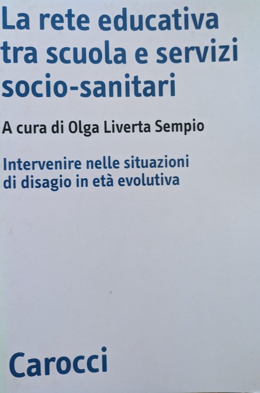 Liverta Sempio Olga (a cura di), La rete educativa tra scuola e servizi socio-sanitari. Intervenire nelle situazioni di disagio in età evolutiva. Carocci, 2003.In-8 (Cm 21,9 x 14,9), pp. 199, brossura editoriale. Collana Biblioteca di testi e studi/214 Psicologia. Minimi segni d'uso, ottimo.