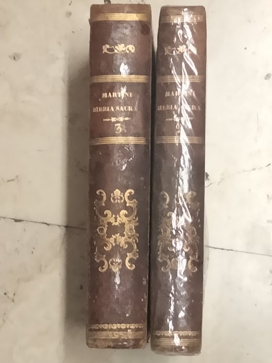 2 voll., in 4° piccolo, m. pelle, pp.700 + 833. Lettere e fregi al d. in o. Inc. e cromolitografia in antip. del 2° vol. Il 2° vol. contiene : Il primo ed il secondo libro dei Paralipomeni; il primo ed il secondo libro di Esdra; il libro di Tobia; il libro di Giuditta; il libro di Esther; il primo ed il secondo libro dei Maccabei; il libro di Giobbe; Il libro dei Salmi; il libro dei proverbi; parabole di Salomone; il libro dell'Ecclesiaste. Il 3° vol. contiene: il libro della Sapienza; il libro dell'Ecclesiastico; profezia di Isaia; Profezia di Geremia; le lamentazioni di Geremia; profezia di Baruch; profezia di Ezechiele; profezia di Daniele; profezia di Osea; profezia di Joele; profezia di Amos; profezia di Abdia; profezia di Giona; profezia di Michea; profezia di Nhaum; profezia di Habacuc; profezia di Sofonia; profezia di Aggeo; profezia di Zaccaria; profezia di Malachia; Cantico de' Cantici. Disp. dei soli due vol. sopra descritti.