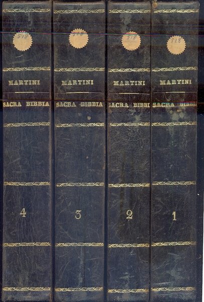 4 voll. , in 4°, m. pelle, pp. XVI + 715 (1° vol. ) + 700 (2° vol. ) + 833 (3° vol.) + 791 (4° vol. ) . Antip. del 2°, 3° e 4° vol. fig. con inc. raffiguranti scene bibliche. Lettere ai d. in oro.