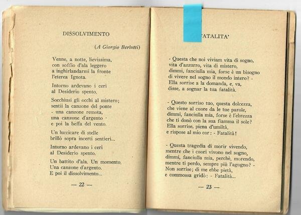 Piccola brossura tascabile, dissolvenza concreta al dorso, bordo frastagliato con strappetti e venature di polvere, tracciano la copertina in carta, fogli velati da leggera ossidazione, con sporadiche sottolineature e fioriture. N. pag. 51.