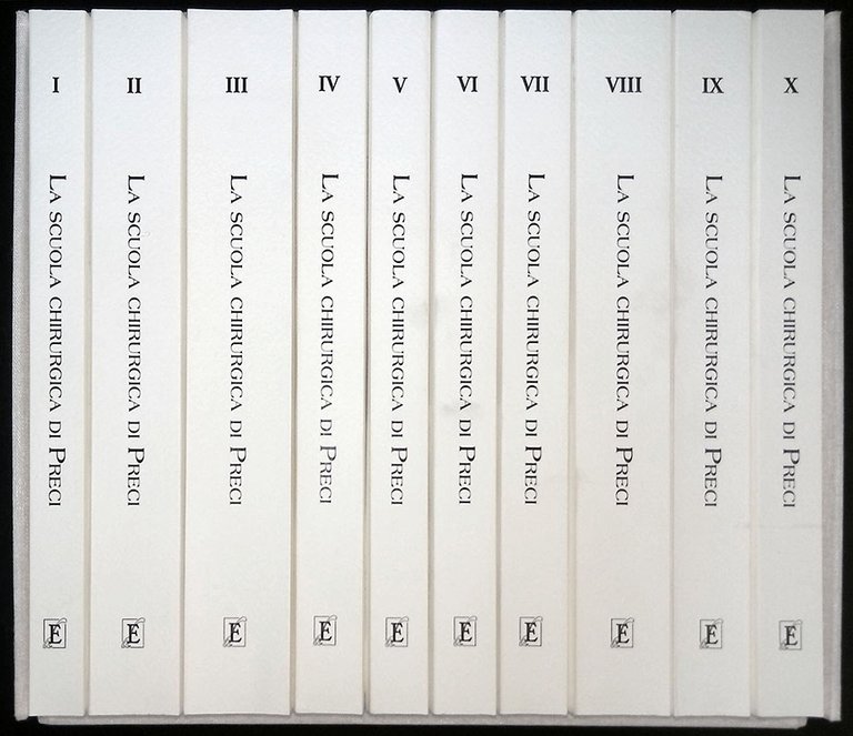 Opera completa in 10 volumi, 3332 p. totali, f.to cm 25x17,5, brossura con cofanetto, nuovi. Indice generale: Vol. I. Tractatus de Putredinae excellentissimi philosophi. Et medici consumatissimi. D. Hieronymi Accoramboni Eugubijordinarij practicae medicinae in gymnasio Patavino. Alex. Tra. Petr. Ad Lectorem. Qua Medici affectum debent putredine corpus Dicere, id, hoc in se per breve claudit opus. Girolamo Accoramboni, 1534.Excellentissimi philosophi et medici consumatissimi D. Hieronymi Accoramboni Eugubii ordinarieim practicae medicinae in Patavino gymnasio legentis. Tractatus de Lacte. Nunc primum impressus. Girolamo Accoramboni, 1535.Tractatus de Catarrho. Clarissimi domini Hieronymi Accoromboni Eugubii. Girolamo Accoramboni, 1536. Vol. II. Sussidio di medicina del molto eccellemte M. Durante Sacchi. Tradotto dal latino in lingua Volgare dal molto eccellente M. Cesare Sacchi dalle Preci, suo fratello, ambedui Medici, Fisici, Chirurgici, e Anatomici. Con licenza dé superiori, e Privilegio. Durante Sacchi, 1559. Opuscoli o Disertazioni Fisico Mediche. D' intorno alle qualità salubri, ed insalubri dell' Aere in genere, di ciascun Paese, ed in Ispecie di quello di Bevagna nell' Umbria. E sopra le virtù Medicinali dell' Acqua Comune, in genere, ed in ispecie di alcune acque Minerali dell' Umbria medesima: come dell' Acqua di Sanavalle, o di S. Claudio di Norcia; di Giacomo di Spoleto; del Barco di Spello; dell' Amerino di Acquasparta; dell' Acqua di Nocera; di Moiano in Assisi, e c. Nelle quali chiaramente esaminate, e spiegate (secondo il sistema più fondato de migliori moderni meccanici, e de più dotti ed accreditati Filosofi sperimentali) si racchiudono dell' aureo Libro de Aeribus, Aquis e Locis del grande Ippocrate le più utili, e le più interessanti dottrine, che concernano spezialmente al retto lodevole esercizio della Medicina pratica nelle Condotte Mediche. Compilati dal dottor Niccolò Antonio Cattani dalle Preci, Medico condotto dall' antichissima Città di Norcia, E dal medesimo dedicati all' illustris. E reverendiss. Monsignore D. Celestino Galliani Arcivescovo di Tessalonica, Cappellano Maggiore della Maestà di Carlo Re delle Due Sicilie, e Prefetto dignissimo dell' Università Reale dé Studi di Napoli. Niccolò Antonio Catani, Assisi, 1745. Vol. III. Felicis Accombonii Nobilis Eugubini Civis Romani Interpretatio obscuriorum locorum et sententiarum omnium operum Aristotelis et precipuorum dubiorum, qua in singulis eius libris moveri solent, ex eius verbis, vel validis rationibus declaratio qua ab alijs interpretibus vel no tacta, vel non adamus sim explanata sunt: et omniu ferme controversiarum, qua versantur inter Platonicos, Galenum et Aristotelem examinatio. Et de fluxu et refluxu maris brevis tractatus. His additur non pavcarum sententiarim difficilium Teophrasti in libris de Plantis explanatio; et in librum Galeni de Temperamentis Annotationes; nec non et literae multarum depravationum emendationes, ex antiquissimis Graecis manuscriptis codic bus depromptae. Felice Accoromboni, Roma, 1590. Subsidium Medicinae, in quo, quantum docta manus praestet ad immanes morbos evellendos mirum in modum elucescit. Que in ipso feriatim tractentur sequens indicabit pagella. Auctore Domino Durante Saccho prec. Cive Fabrianensi Chirurgo, atq; Physico espertissimo. Adiecta est preterea eiusdem Epistola de medicine Laudibus non spernenda, ad perillustrem, ac Reverendissimum Dominum D. Iulium, Octinellum Episcopum Fanestrem. Durante Sacchi, Urbino, 1596. Vol. IV. Lettera all' Ill. Valsava sopra la Cateratta Glaucomatosa. Antonio Benevoli, 1722. Lettera di Pierpaolo lapi dalle Preci oculista, e litotomo. Adf un suo amico della medesma professione, dove esaminandogli una lettera del Sig. Dottor Cocchi, gli mostra alcuni errori tra gli altri esser falso, che l' Umor Cristallino sia sempre la vera sede della sussussione detta vulgarmentenCateratta. Pierpaolo Lapi, Rimini, 1722. Pratica delle principali e
