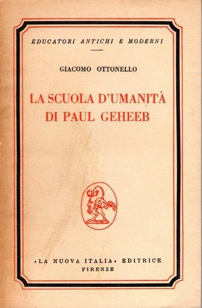 La scuola d'umanità di Paul Geheeb, prima edizione febbraio 1966, pp. 271, formato 13 x 19,5.<BR>Copertina morbida di colore beige con titoli in nero e rosso al piatto anteriore e sul dorso. All'interno presenti alcune tavole fotografiche in b/n.Presente dedica dell'autore datata 29 settembre 1974. <BR>Dorso brunito. Leggera brunitura al piatto anteriore. Nel complesso condizioni molto buone.