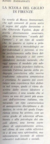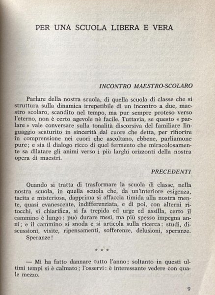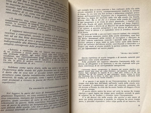 Soggetti: Pedagogia, Didattica, Educazione, Scuola, Formazione, Esperienze, Maestri, Alunni, Scolari, Scuole, Metodi educativi, Firenze, Toscana, Apprendimento, Insegnamento, Poesia, Sera d'ottobre, Giovanni Pascoli, Metodo naturale, Scuola integrale, Bambini, Apprendimento, Docenti, Anni Sessanta, Italia, Elementari, Medie, Programmi scolastici, Attività extra-scolastiche, Giochi, Musica, Colori, Gite, Osservazione, Vocaboli, Numeri, Scuola attiva, Religione, Ordini religiosi, Progresso didattico, Materie, Amore, Individuo, Persona, Valorizzazione, Scolari, Scuola popolare, Moduli, Attivismo italiano, Maria Montessori, Aldo Agazzi, Autogoverno disciplinare, Socializzazione, Socialità, Ambiente, Psicologia, Critica, Commentari, Organizzazione, Educatori, Amore, Ascolto, Capi-gruppo, Scout, Preghiera, Meditazione, Raccoglimento, Arte, Grammatica, Fanciulli, Personalità, Disturbi psichici, Ritardo, Disadattati, Fiducia, Grazia, Cristo, Gesù, Cattedra, Crocifisso, Studio, Attitudini, Casa, Famiglia, Accoglienza, Lingua, Linguistica, Lombardo-Radice, S.I.M., Ideali, Patria, Incontri, Maestro-scolaro, Rapporti, Relazioni sociali, Lettura, Talento, Esami, Geografia, Storia, Scienze, Aritmetica, Matematica, Letteratura, Geometria, Ispettori, Lettere, Colloqui, Genitori, Composizione, Sintassi, Analisi, Gruppo, Ricreazione, Storie vere, Racconti, Libri rari, Libri Vintage Fuori catalogo, Collezionismo, Lavagna, Compiti, Libertà, Disciplina, Lambruschini, Ispettori, Ruoli, Scambio, Premi, Biblioteca, Ricerche, Comunità, Pedagogy, Didactics, Education, Training, Experiences, Teachers, Pupils, Schools, Educational methods, Florence, Tuscany, Learning, Teaching, Poetry, Natural method, Integral school, Children, Learning, Teachers, Sixties, Italy, Elementary, Middle, School programs, Extra-curricular activities, Games, Music, Colors, Trips, Observation, Vocabulary, Numbers, Active school, Religion, Religious orders, Didactic progress, Subjects, Love, Individual, Person, Valorization, Folk, Modules, Italian activism, Disciplinary self-government, Socialization, Sociality, Environment, Psychology, Criticism, Commentaries, Organization, Educators, Love, Listening, Leaders, Prayer, Meditation, Gathering, Art, Grammar, Children, Personality, Psychic disorders, Delay, Misfits, Trust, Grace, Christ, Jesus, Chair, Crucifix, Study, Attitudes, Home, Family, Hospitality, Language, Linguistics, Ideals, Meetings, Teacher-pupil, Relationships, Social relations, Reading, Talent, Exams, Geography, History, Science, Arithmetic, Mathematics, Literature, Geometry, Inspectors, Letters, Interviews, Parents, Composition, Syntax, Analysis, Group, Recreation, True Short stories, Rare books, Out of print books, Collectibles, Blackboard, Tasks, Freedom, Discipline, Inspectors, Roles, Exchange, Awards, Library, Research, Community