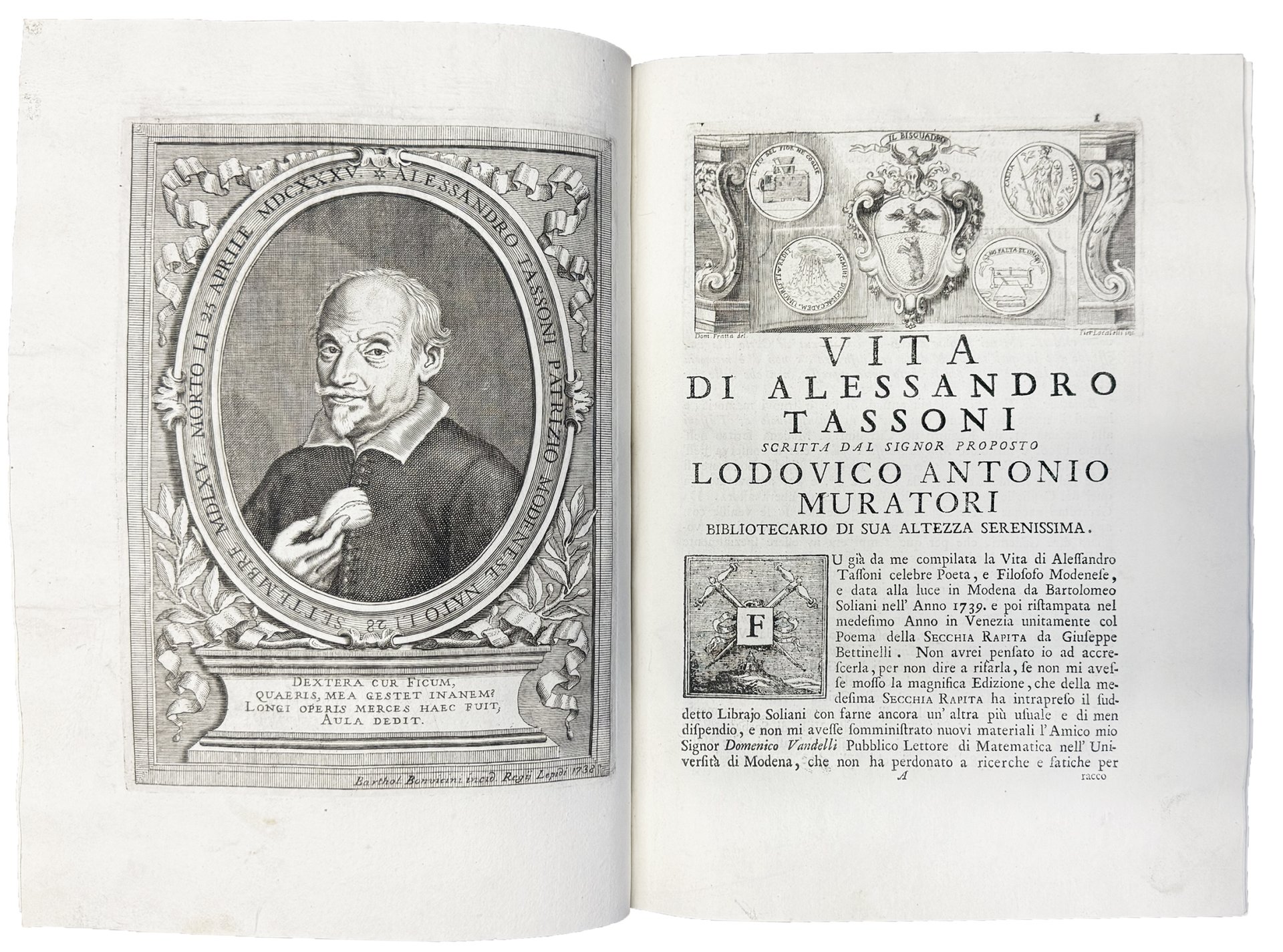 Celebre edizione figurata del poema tassoniano, corredata da splendide figure in rame e dagli apparati critici di Gaspare Salviani e Giovanni Andrea Barotti.