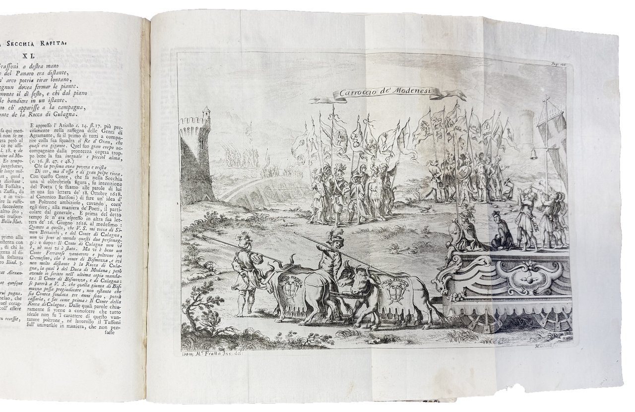 In 4to (mm. 270x200). Pp. LX, 92, 489, [3: errata e legno a piena pagina raffigurante la Ghirlandina] con antiporta, ritratto dell'autore, 12 tavole poste all'inizio di ogni canto, 1 tavola ripiegata con il Carroccio, 2 carte geografiche ripiegate (Tavola geografica del Modenese e Tavola geografica del Padovano, e Romagna, entrambe di Domenico Vandelli), 1 tabella genealogica ripiegata ed 1 facsimile di scrittura del Tassoni. Le tavole sono incise in rame da F. Zucchi, A. Bolzoni, G. Cantarelli, G. Benedetti, B. Bonvicini ed A. Zuliani su disegni ed invenzioni di D.M. Fratta, F. Villani ed altri. Frontespizio stampato in rosso e nero. Solida legatura ottocentesca in mezza pergamena con piccole punte, tassello in marocchino rosso con titolo in oro al dorso, piatti in carta marmorizzata. Strappetto restaurato nel margine bianche di p. 33, piccolo rinforzo al verso di una delle due carte geografiche, tavola del Carroccio in parte leggermente ingiallita, nel complesso esemplare fresco e genuino.