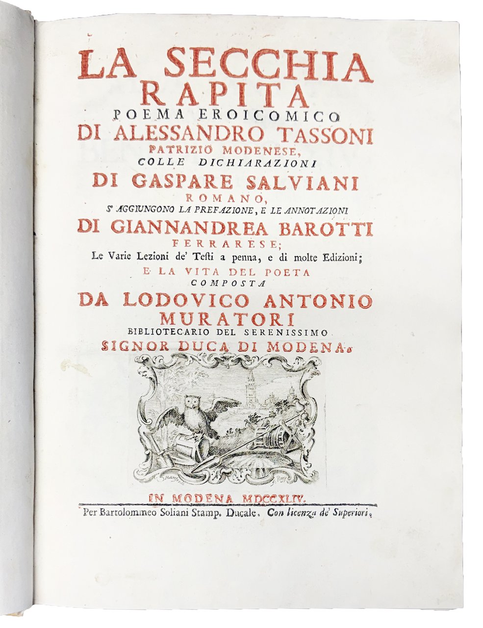 La secchia rapita poema eroicomico di Alessandro Tassoni patrizio modenese, colle dichiarazioni di Gaspare Salviani romano, s'aggiungono la prefazione, e le annotazioni di Giannandrea Barotti ferrarese; le varie lezioni de' testi a penna, e di molte edizioni; e la vita del poeta composta da Lodovico Antonio Muratori [...]
