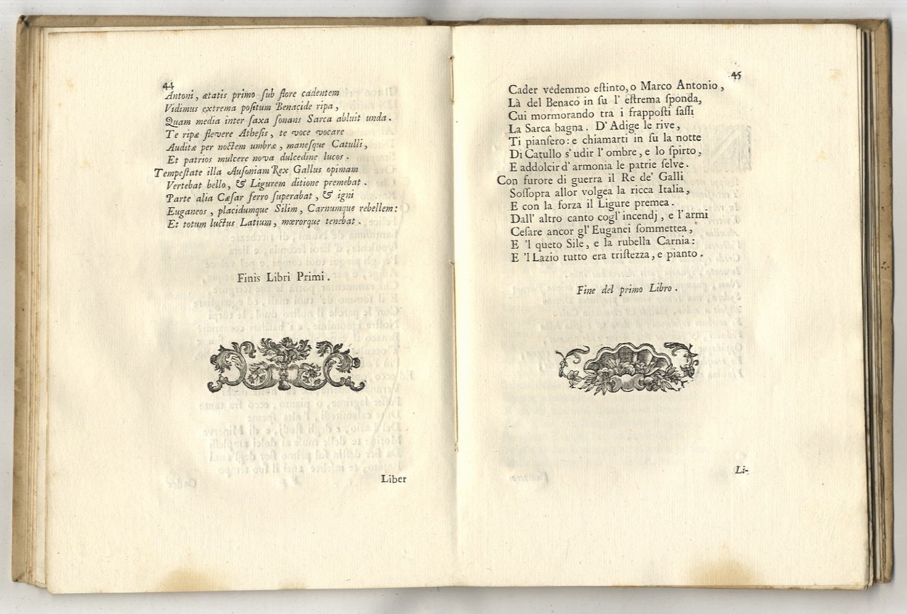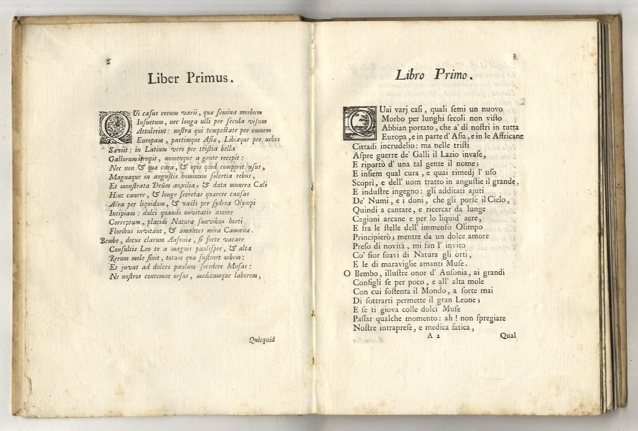 (In fine: In Bologna), (a S. Tommaso d'Acquino), (1738), in-4, cartonatura rustica coeva, pp. VIII, 136. Iniziali e fregi xilografici. Testo latino e italiano a fronte. Colophon a carta R4v. Ottimo esemplare.