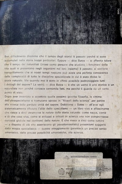 Dopo aver inventata o accettata quella pessima ipocrita filosofia, le vittime. dell'ultraspecialismo si tramutano spesso in "filosofi della scienza" per partire alla ricerca della perduta unità del sapere. Dobbiamo a Bates all'aver egli sistematicamente rifiutato l'alibi dello specialismo un libro vivo e affascinante che riesce a dirci veramente la natura della storia naturale: come nasca, come. e di che cosa viva, come si sviluppi e articoli in scienza una non compromessa. curiosità globale nei confronti della natura. E che riesce a dirci come tuttora a dispetto di ciò che asseriscono gli pseudomoralistici pessimismi suggeriti dalla miopia specialistica questo atteggiamento garantisca un preciso senso umanistico, delle precise possibilità umanistiche, alla scienza.
