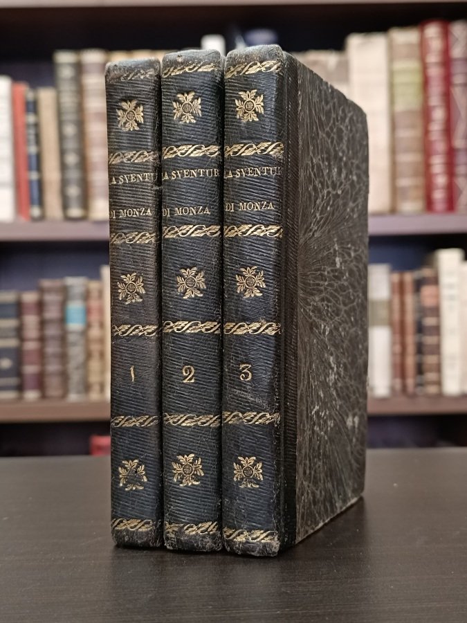 <span style="font-style: normal;">3 volumi in-12° (cm. 15,7), legature coeve in mezza pelle verde inglese, dorsi lisci con titolo e fregi fitomorfi in oro, piatti marmorizzati (lievi abrasioni, minime tracce d'uso); pp. [4] 245 [3], 260 [2b], 273 [3] in stato più che discreto (alcune fioriture, ultima carta bianca al vol. II caduta, macchia al margine interno in fine al vol. III, antiche note manoscritte e tracce d'inchiostro ai risguardi dei vol. II e III). Edizione di successo, qui completa in 3 volumi, del romanzo storico sulla Monaca di Monza del Rosini, il cui nome, non presente al frontespizio, si desume dalla dedicatoria «alla ornatissima donna la signora G. D. C. M. D. B.». Collana </span><i>Ape Romanziera o Raccolta de' migliori romanzi inediti</i>. Buon esemplare. (NP6)