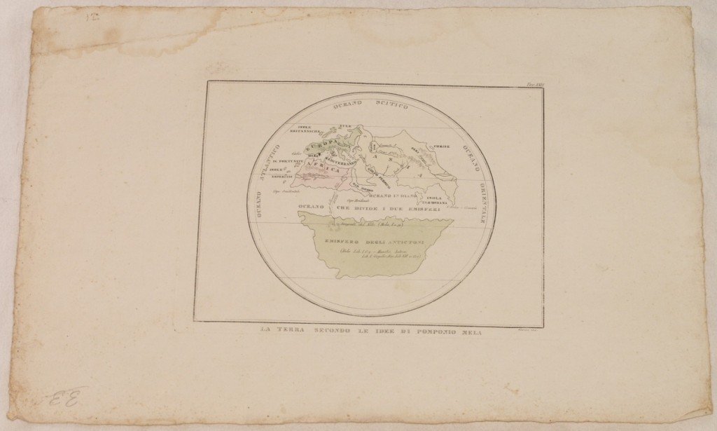 Bella mappa acquarellata del 1840 circa che rappresenta la terra secondo le idee di Pomponio Mela incisa da Carini. In buone condizioni. DIMENSIONI FOGLIO: cm 44,5x29,5 DIMENSIONI INCISIONE: cm 22,5x19 EPOCA: 1840 circa CONDIZIONI: Buone, fioriture e piccola gora d'umidità all'angolo superiore sinistro. Very beautiful coloured map with aquarello representing the earth according to the ideas of Pomponio Mela of around 1840 engraved by Carini. LEAF DIMENSION: 44,5x29,5 ENGRAVING DIMENSION: cm 32x22 DATE: 1840's CONDITIONS: Good. Foxings and little humidity stain in the upper left corner.