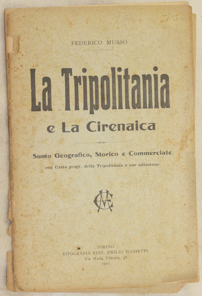 In 8. Dim. 21x13,5 cm. Pp. 47+(1). Interessante pubblicazione del 1912 sulla Tripolitania e la Cirenaica scritta da Federico Musso. Una mappa in antiporta. Tra gli argomenti trattati: situazione geografica, flora fauna e minerali, vicende storiche, principali città e abitanti, vita pubblica commercio e industrie, usi e costumi, occupazione italiana della Tripolitania ecc.<BR>In discrete condizioni e completo. Copertina editoriale in discrete condizioni generali con usure ai margini e dorso. Piatti staccati. Parti mancanti. Legatura in buone condizioni. All'interno le pagine si presentano in buone condizioni con fioriture.Interesting pamphlet of 1912 about Tripolitania and Cirenaica written by Federico Musso.<BR>A map in the frontspice. Between the issues treated: geography, animals plants and minerals, history, mainn cities and inhabitants, public life trade and industries, usages and costumes, italian occupation of Tripolitania ecc.<BR> In fair conditions and complete. Editorial cover n poor general conditions withy wearings and missing parts in the edges and spine. Plates are detached. Binding in good conditions. Inside pages are in good conditions with foxings.