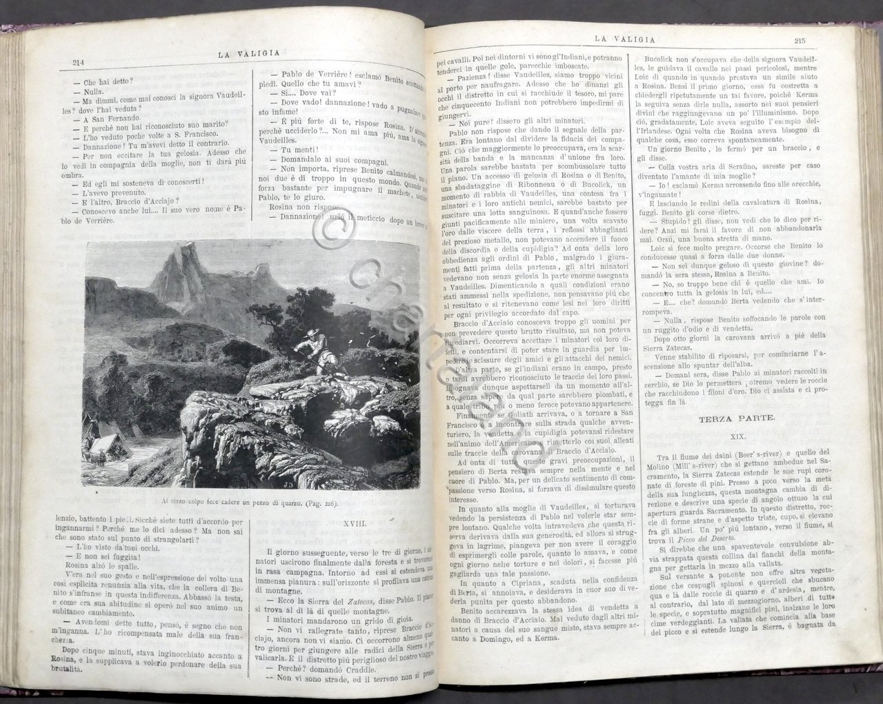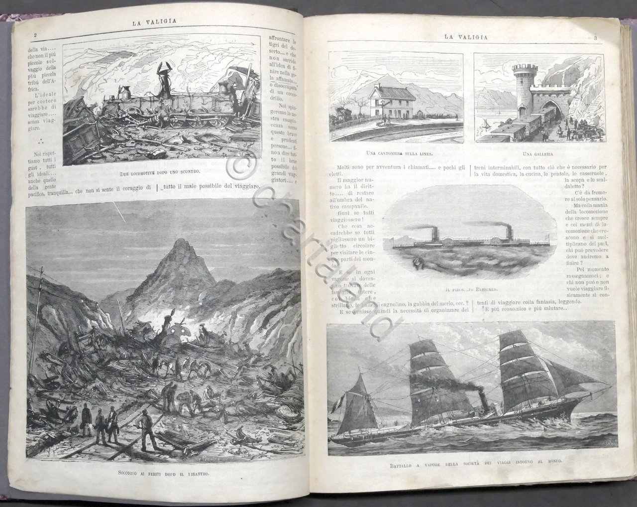 La Valigia - Foglio illustrato settimanale - Viaggi, Letteratura, Storia, Belle Arti, Racconti, Notizie Geografiche, Varietà - 1879 / 1880 Pag. 540 illustrate da numerose e splendide incisioni. All'interno raccolta di articoli e di racconti a puntate, alcuni completi, tra cui: I cercatori d'oro, Viaggio alle sette meraviglie del mondo, Viaggio di Stanley attraverso l'Africa, Passeggiata nell'India, Fra i ghiacci, Abissinia, Attraverso gli Stati Uniti, etc. Copertina rigida non coeva - Testo in italiano. Condizioni buone. Frontespizio con piccolo restauro. Legatura e sguardie rifatte.