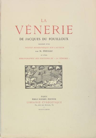Paris, Emile Nourry, Editeur, 1928. Grand In/4 broché, couverture imprimée en rouge et noir, 266 pages. Illustrations : reproductions de bois de l'original de 1585. Avec une notice biographique sur l’auteur par M. Pressac et une bibliographie des éditions de “ La Vénerie “. La plus soignée des éditions modernes de “ La Vénerie de Jacques du Fouilloux “ qui reproduit intégralement celle de 1585, texte, gravures et ornements typographiques. Thiébaud, 311-312.