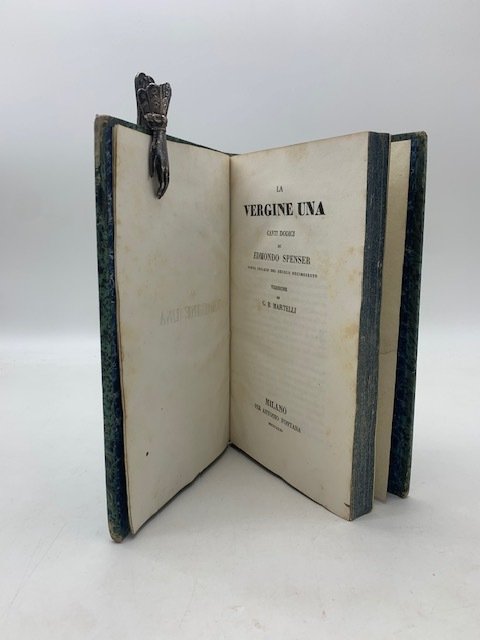 In 8 (cm 13 x 21), pp. XXII + 287 + (1) di errata. Il foglio con le pagine V e VI (con la dedica a Vincenzo Monti e a Bernardino Mandelli, al recto, e bianca al verso) è inserito tra le pagine XXII e 1. Edizione originale della traduzione italiana, curata da Giovan Battista Martelli, della prima leggenda, in dodici canti, intitolata “The legend of the knight of the red cross or of holiness”, del poema rinascimentale “The faerie queene” di E. Spenser. Nella prefazione dell'opera, dedicata agli amici Monti e Mandelli, a quel tempo scomparsi, l'A. afferma di avere scelto questa parte del poema, oltre che per la sua compiutezza, per le sue connotazioni classiche. Martelli prosegue affermando di aver trovato difficoltà nella traduzione e di aver scelto di adattare i nove versi della strofa spenseriana all'ottava rima italiana. La traduzione fu molto elogiata e venne ristampata a Napoli l'anno seguente e a Venezia nel 1847. Giovan Battista Martelli (Milano, 1780 - Borgoticino, 1850) fu avvocato e letterato legato da grande amicizia a Monti. Nella battaglia tra classici e romantici si tenne sostanzialmente dalla parte dei classici.