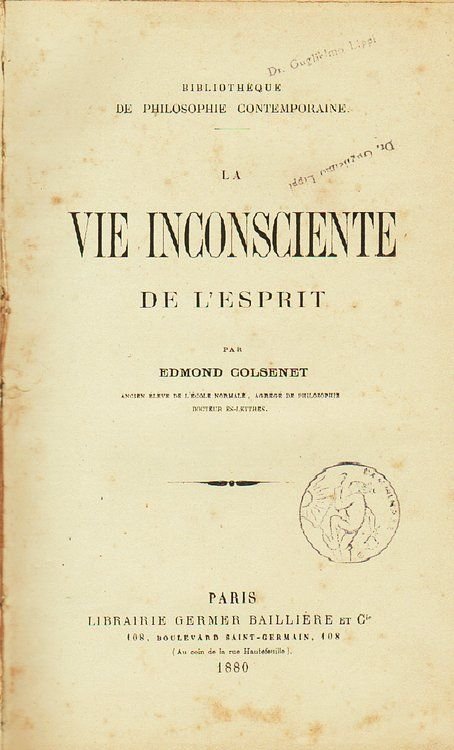 In-8°, legatura in tutta tela con la brossura ed. riportata al piatto, pp. II-277(1) e 32 di catalogo editoriale. Vecchi leggeri aloncini e fioriture. Macchie da vecchi aloni alla brossura sul piatto. Vecchi timbro di appartenenza al frontespizio. Edmond Eugène COLSENET (Besançon, 1847 - 1925) è stato un filosofo e accademico francese. A partire dalle tesi di Karl Robert Eduard von Hartmann, questo studio traccia una chiara distinzione tra psicologia e metafisica.