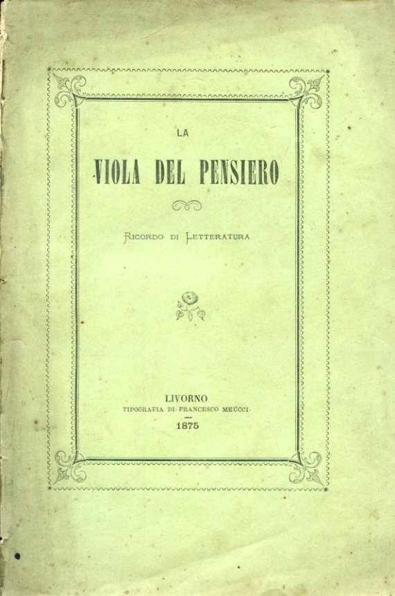 In-8°, pp. 127, brossura editoriale verde con titolo entro bordure ornamentali. Una dedica del tempo all'occhietto. Testo entro cornice tipografica. Qualche menda al dorso, normali fioriture. Buona copia serbata entro velina. Strenna con prose e poesie di autori vari, tra cui Giovanbattista Nicolini, Giovanni Marradi, Isidoro Del Lungo, Giuseppe Giusti (è pubblicata una sua lettera inedita).