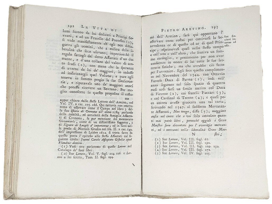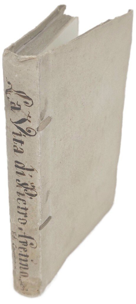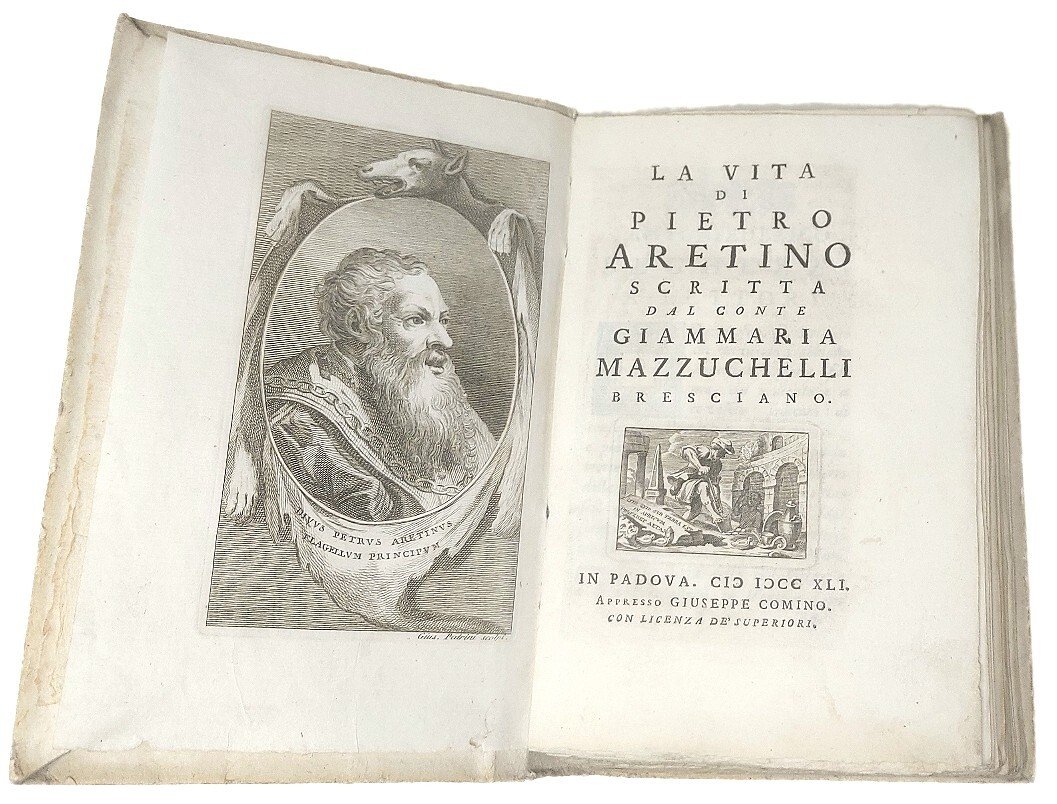 >in-8, pp. VIII, 303, (1), legatura coeva in cartonato rustico, titolo calligrafato lungo il dorso. In antiporta ritratto dell'Aretino inciso da Giuseppe Patrini, inoltre completo di 6 tavole di ritratti inc. in medaglione f.t. Edizione originale di importante e poco comune biografia dell'illustre Aretino, scritta da G.M. Mazzuchelli (Brescia 1707-1765), con ampi cenni bibliografici e una difesa accanita dell'uomo e dello scrittore, che definì ''poeta tosco, di tutti parlò mal fuor che di Cristo, scusandosi col dir: non lo conosco''. Precede l'opera dedica ai Lettori del Seghezzi; in fine aggiunte 4 pp. con il catalogo dei "Libri Cominiani ancora vendibili''. Esemplare perfetto, freschissimo e a pieni margini. Gamba, 2349, nota: ''Il Zeno, ch'ebbe a leggere la prima edizione di Padova, 1741, scrisse che nel suo genere e per ogni verso e' opera eccellente ed originale''. Brunet, III,1563. Graesse, IV,459. Renda-Operti 743.