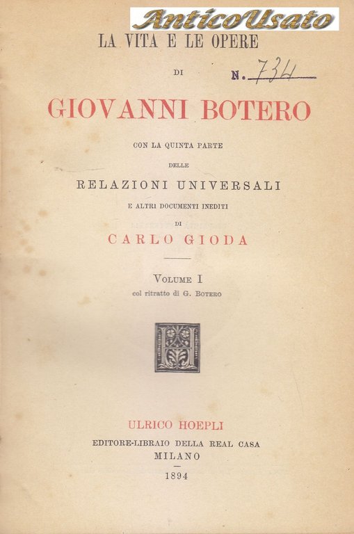 LA VITA E LE OPERE DI GIOVANNI BOTERO di Carlo Gioda 3 volumi 1895 Hoepli libro