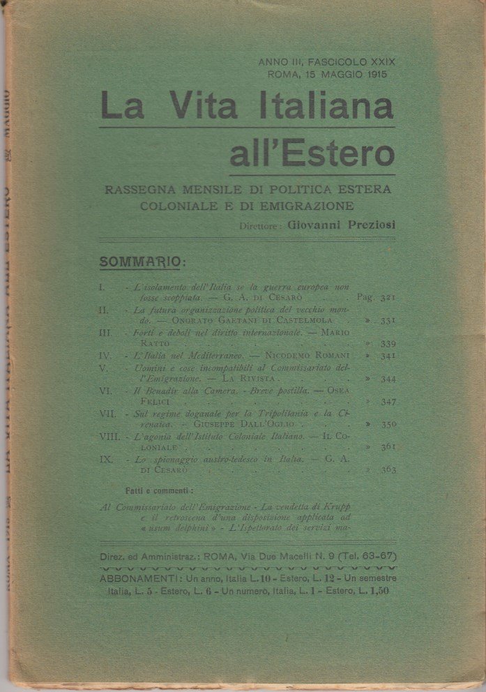 In-8 (Cm 25 x 17), pp. da 321 a 400, brossura editoriale. Normali segni del tempo. MOLTO BUONO - Sommario: G.A. di Cesarò: L'isolamento dell'Italia se la guerra europea non fosse scoppiata - Onorato Gaetani di Castelmola: La futura organizzazione politica del vecchio mondo - Mario Ratto: Forti e deboli nel diritto internazionale - Nicodemo Romani: L'italia nel Mediterraneo - La Rivista: Uomini e cose incompatibili al Commissariato dell'Emigrazione - Osea Felici: Il Benadir alla Camera - Giuseppe Dall'Oglio: Sul regime doganale per la Tripolitania e la Cirenaica - Il Coloniale: L'agonia dell'Istituto Coloniale Italiano - G.A. Di Cesarò: Lo spionaggio austro-ungarico in Italia