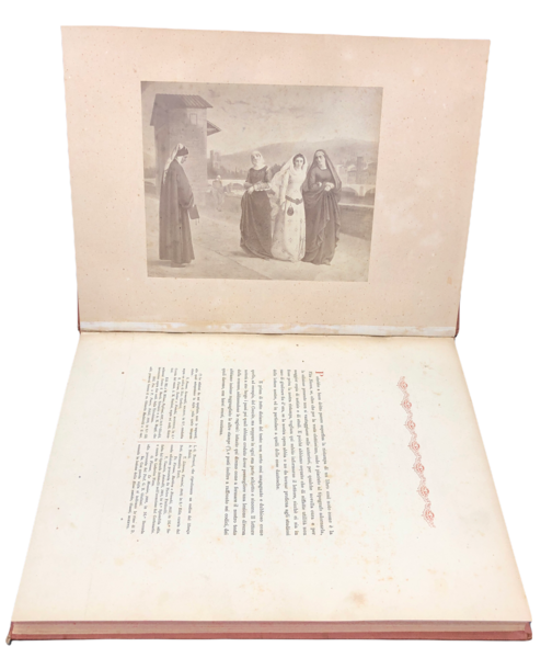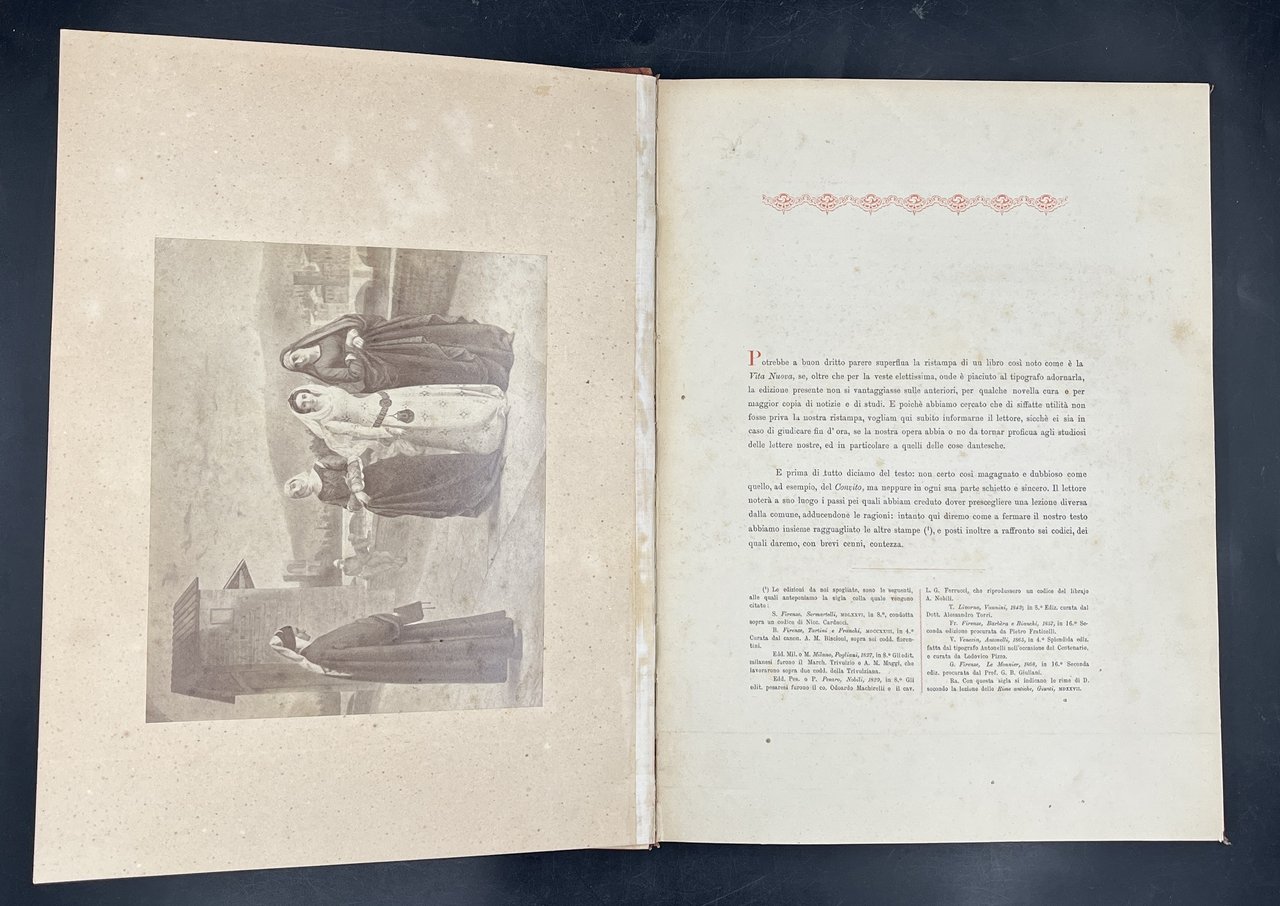 In-4° (cm. 30.8x22,6), pp. LX + 128 + 1 TAVOLA fuori testo, vera foto all'albumina applicata su cartoncino di un dipinto raffigurante l'incontro con Beatrice. Solida sobria tela marron e oro, più recente. Pregiata veste tipografica in rosso e in nero ad ampi margini. Timbro di privata allart. al verso del piatto. Opera ben completa di testo e tavola. Per "illustrazioni" nel titolo si intendono le fittissime annotazioni (solo quelle al testo dantesco occupano ben 67 pagine! Un'annotazione a lapis dichiara "le note con l'asterisco sono del prof. Carducci. SBN lo censisce in sole 4 bibl., ma non dichiara le LX pagine su Beatrice e poi dichiara solo 125 pagine, mentre invece sono 128, con un interessante testo finale intitilato "Licenza".