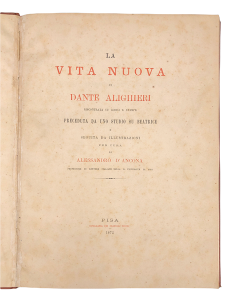 La VITA NUOVA di Dante Alighieri riscontrata su Codici e stampe preceduta da uno studio su Beatrice e seguita da illustrazioni per cura di Alessandro D'Ancona professore di lettere italiane nella R. Università di Pisa.
