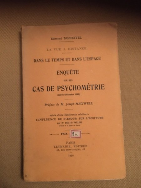La vue a distance. Dans le temps et dans l'espace. Enquete sur des cas de psychometrie (Janvier - Decembre 1909) Preface de M. Joseph Maxwell. Suivie d'une conference relative a L'influence de l'amour sur l'ecriture par M. Paul de Fallois.