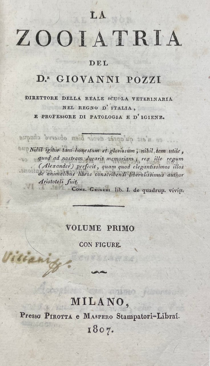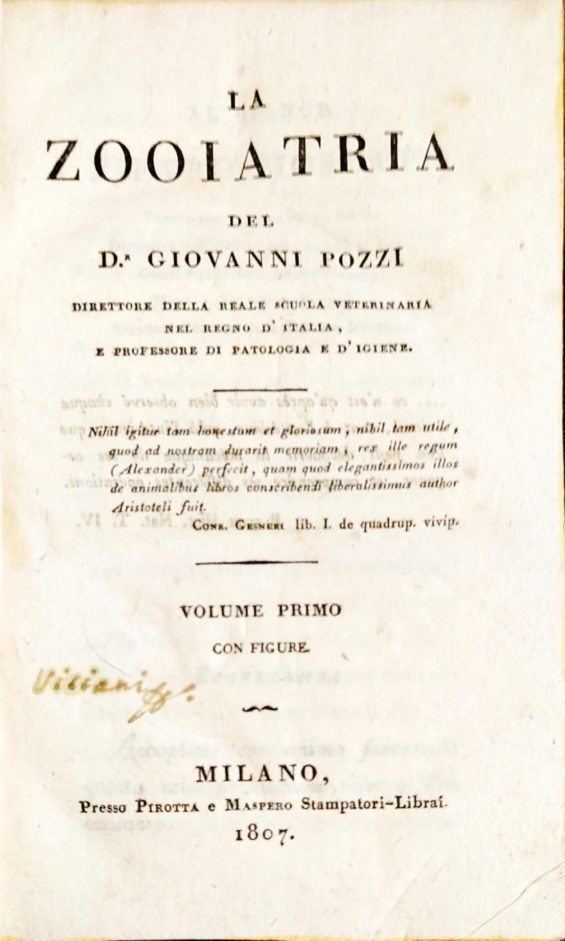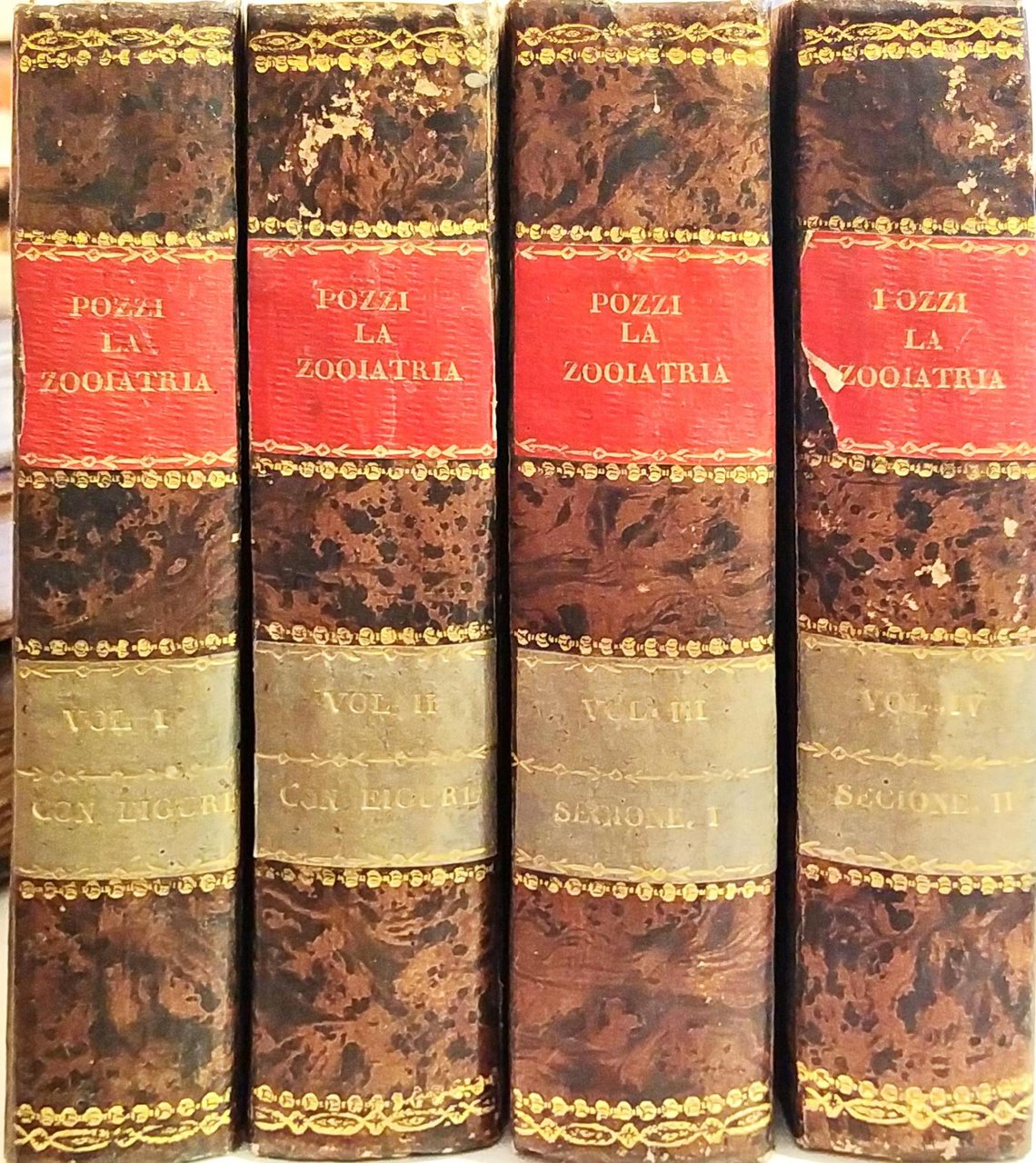Repertorio di veteriniana, dedicata in maniera particolare, ma non esclusivamente, al cavallo e ai bovini: la storia della zooiatria , l'anatomia e la "scelta del cavallo", la ferratura, le malattie, le cure e i rimedi medici. 5 delle 10 tavv. originariamente previste f. t. in ottavo leg. mezza pelle con titolo su tasselli e fregi in oro, tagli spruzzati 4 voll. Buono (Good) Buon es..