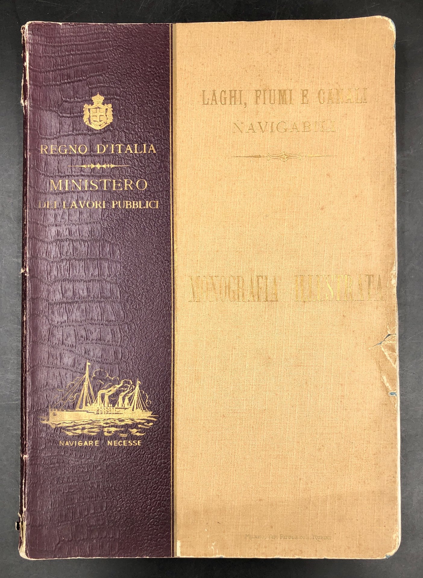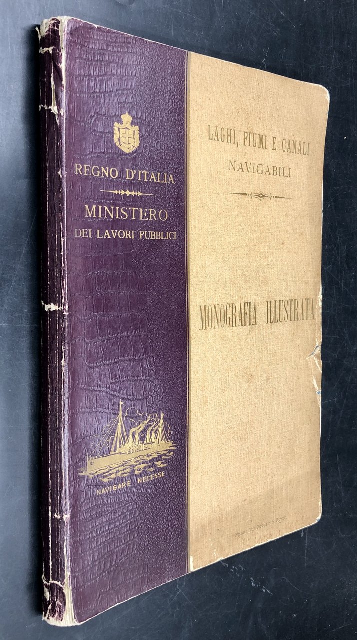 In-4° (31,5x21,7), pp. 228 + 8 TAVOLE f.t. (5 con vedute: Locarno, Como, l'Arno, can. di Vizzola e Villoresi; e 4 carte e topogr.: idrografia d'Italia, Tevere e canali Pontini, Tevere in Roma, Arno e canali PI LI Viareggio) + grande CARTA a 3 col. ripiegata con la RETE navig. d. Valle PADANA + schema grafico della rete d. Val del PO. Con 267 VEDUTE b.n. n.t. Eleg. cartoncino decorato ed. con tit. stemma e battello oro. Lieve tacca marg. a cop. e prime 24 pp., mende lievi alle cuffie, ma buon es. su lussuosa carta patinata. Antica firma propr. e data al front.