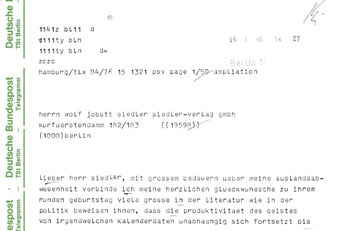 Längeres Original-Telegramm des vormaligen Bundeskanzlers Helmut Schmidt an den Verleger Wolf Jobst Siedler.