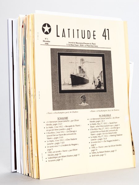 30 numéros in-4, Latitude 41. Journal de l'Association Française du Titanic. Du n° 1 de décembre 1998 au n°30 d'octobre 2006 Bel et rare ensemble réunissant les 30 premiers numéros ! On joint par ailleurs les numéros 35, 37/38 et 39/40. Avec quelques courriers et documents joints.