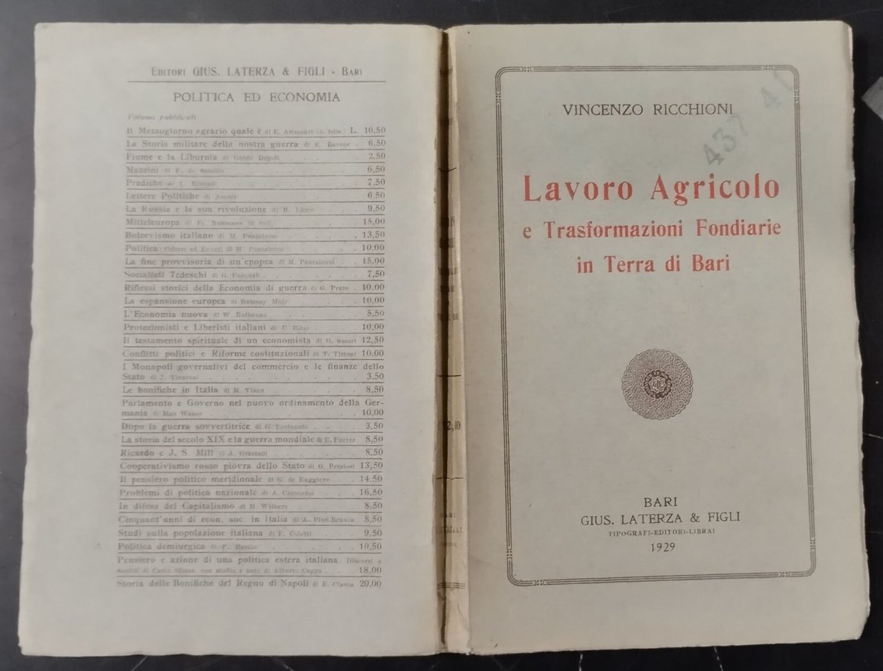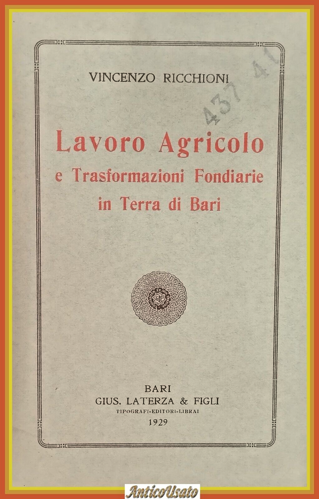 LAVORO AGRICOLO TRASFORMAZIONI FONDIARIE TERRA DI BARI Ricchioni Laterza Libro