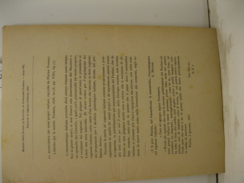 In 8, pp. 20. Br. muta coeva. Estratto dalla Rivista di Filologia ed Istruzione Classica, anno VII, gennaio-febbraio 1879. Critica di Flechia allo studio di inomastica di Pietro Fanfani intitolato Le accorciature dei nomi propri italiani.
