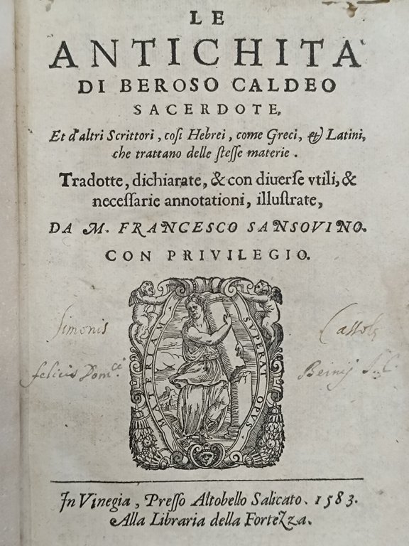 Le antichità di Beroso Caldeo sacerdote, et d'altri scrittori, cosi hebrei, come greci et latini, che trattano delle stesse materie. Tradotte, dichiarate [.] da M. Francesco Sansovino.