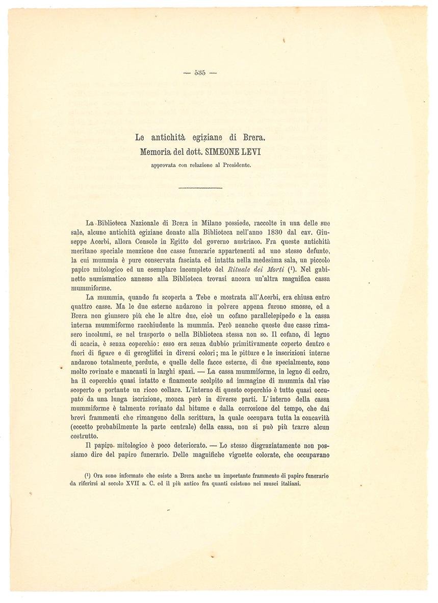 Le antichità egiziane di Brera. Memoria del dott. Simeone Levi approvata con relazione al Presidente.