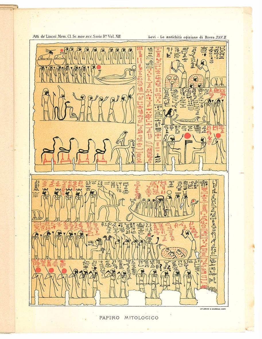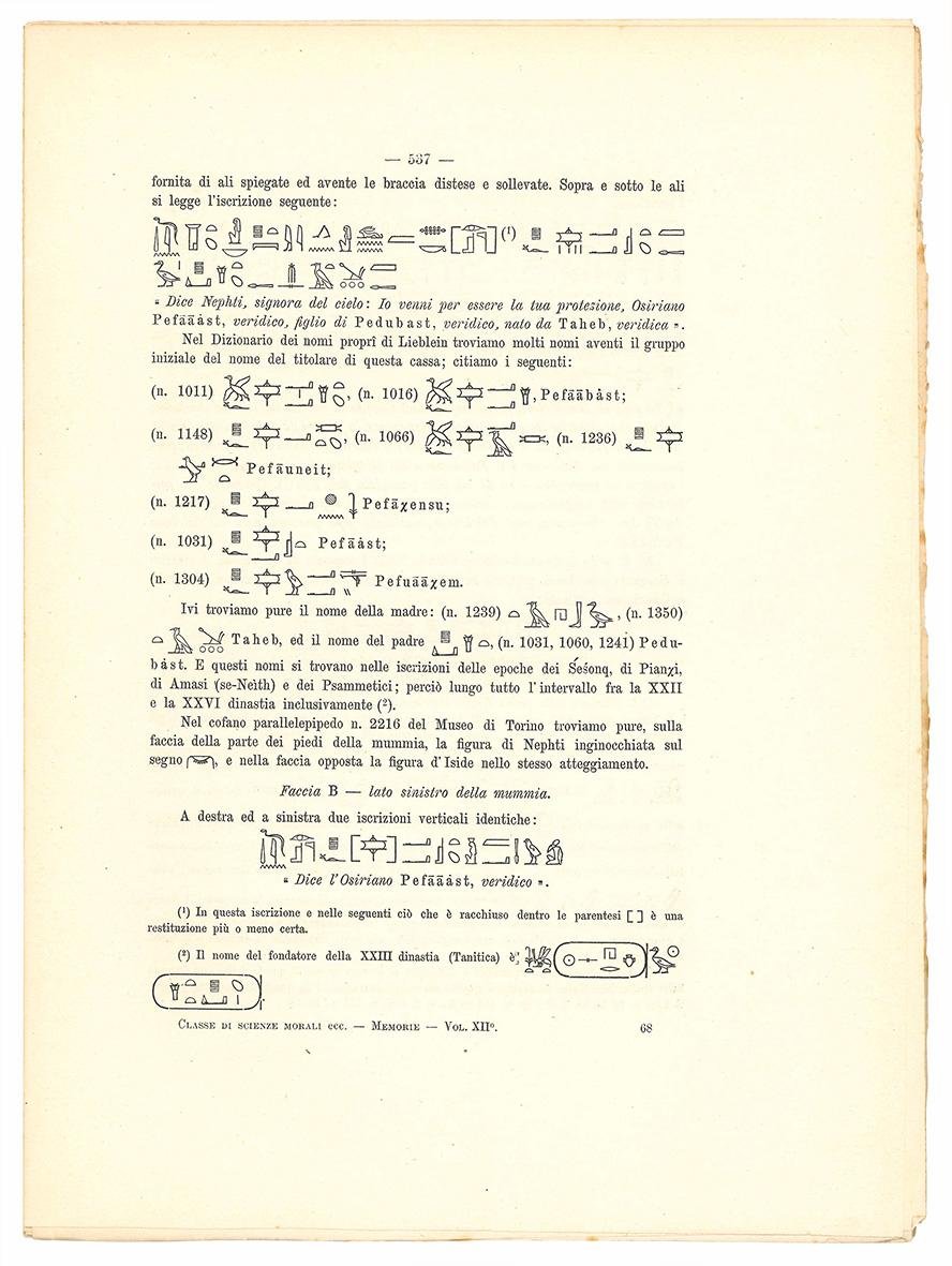 In 4vo (mm 296x214); pp. 535-585, [1], II c. di tav. fuori testo. Numerosissimi esempi di geroglifici nel testo, II c. di tavola cromolitografiche, incise da Bruno e Salomone di Roma, raffiguranti una cassa parallelepipeda egizia e un papiro con scene di mitologia egizia. Non rilegato e un po' sciolto.