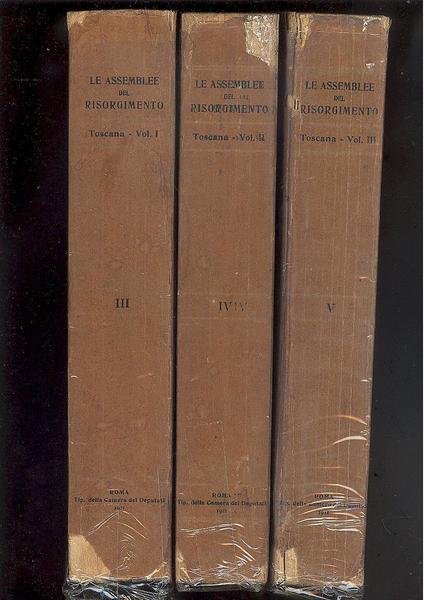 TRE VOLUMI IN 4°. VOL.1°, pp.LXXIX + ( 1 ) + 806. VOL.2°, pp.VIII + 841 + (1 ). VOL.3°,pp.XII + 780.<BR>COPERTINE IN BROSSURA EDITORIALE CON TITOLO. FONDAMENTALE DOCUMENTAZIONE<BR>DA CUI SI RICOSTRUISCE IL CAMMINO DELLA FORMAZIONE DEL NOSTRO PAESE ATTRAVERSO GLI ATTI DELLE ASSEMBLEE COSTITUENTI NELLA TOSCANA, RACCOLTI E PUBBLICATI PER DELIBERAZIONE DELLA CAMERA DEI DEPUTATI. SEGNI DEL TEMPO CON<BR>PICCOLE MANCANZE AI DORSI DEL 2° e 3° VOL., ALTRIMENTI OTTIMA CONSERVAZIONE.<BR>VOLUMI INTONSO. id, 3205