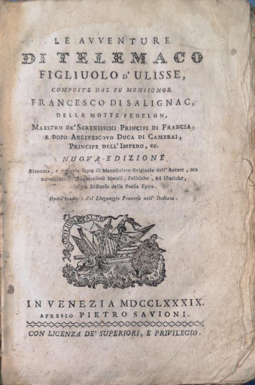 Le avventure di Telemaco figliuolo d'Ulisse, composte dal fu monsignor Francesco di Salignac, della Motte Fénelon . opera tradotta dal linguaggio francese nell'italiano