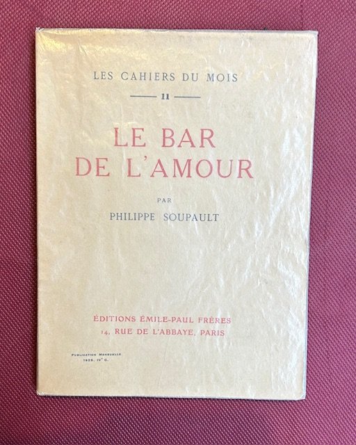 In-8°, pp. 92, (2), brossura editoriale. Edizione originael. Tiratura di esemplari numerati su carta 'pur fil Lafuma', il nostro è il n. 106. Dopo la pubblicazione della sua prima raccolta di poesie Aquarium, del 1917, Soupault fondò con Louis Aragon e André Breton la rivista Littérature e partecipò con altri scrittori, raccolti intorno a Tristan Tzara, al movimento dadaista. In questo periodo compose Les champs magnétiques, scritto in collaborazione con Breton, che può considerarsi il primo esperimento di scrittura automatica nel chiaro tentativo di indirizzare il dadaismo, sempre nell'ambito dell'avanguardia letteraria, a forme più vicine al surrealismo. Nel 1927 Soupault si dedicò al giornalismo e al romanzo, genere quest'ultimo che sino ad allora lo scrittore non aveva mai voluto prendere in considerazione. I suoi romanzi risentono dell'esperienza surrealista e ne conservano i modi espressivi tesi e allucinati.